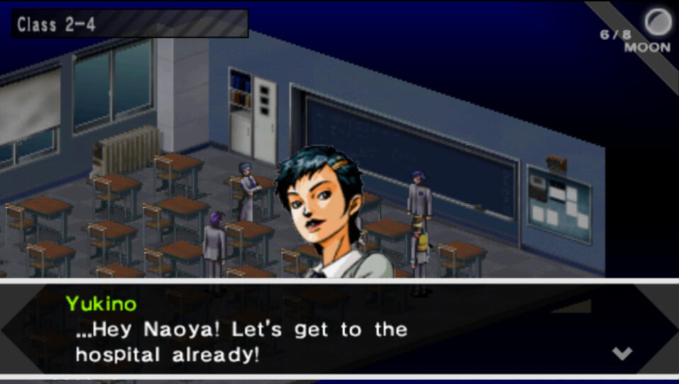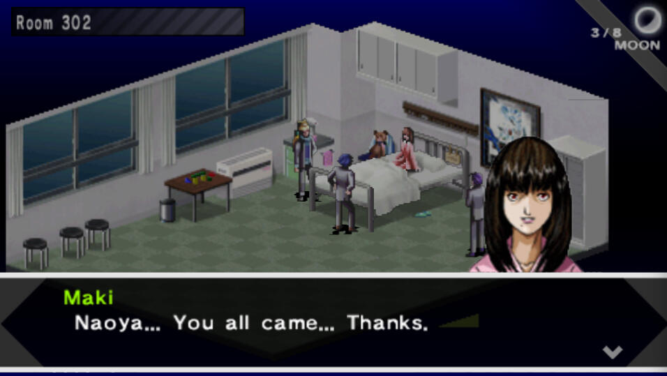 After entering, there is a short cutscene. Once it's over, go ahead and enter the door. Maki is in Room 302 so just head straight to 3F and enter the second door on the right.After some scenes, you will find yourself looking at the battle screen for the first time. This first battle happens automatically like a cutscene. After the battle you will all level up, go ahead and allocate your MC's points however you like. The other party members will auto-allocate their points. Once the scenes are all over and you're in control again, speak to everyone if you like, and then exit the room.There will now be random encounters. Please note that the Analyze feature does not take up a turn, and all you have to do to unlock the details for each creature is defeat them in battle once. From then on, you'll have all their weaknesses and info when you encounter them again. This is a crucial and very useful feature.The Contact feature allows you to enter a negotiation with the demons to gain various things such as items, or healing. But the most important thing here is Spell Cards. To get their Spell Cards, you must raise their eagerness (yellow) to max. This is honestly kind of hard to figure out on your own, so I have included a complete guide on what to say to each specific persona hereTurn south and enter the first room around the corner to find the 2F Nurse's Center. Open the chests to find Medicine x6 and QQ Helmet x2. Equip the helmets, exit the room, and head west. Enter the room around the corner to find an Agastya Tree. When finished, head up the stairs to 3F.Follow the path until you reach the second fork. Enter the Nurse's Station to the right and open the chests to find DisPoison and QQ Helmet x2. Equip the helmets on your other two team members, then exit the room. Head down the halls northwest until you find the stairs. Go downstairs to 2F.Follow the left hallway around to the first room you see to find another Agastya Tree. Then, head straight east to find another set of stairs. Go down the stairs to 1F.Hug the corner around to the right and follow the hallway until you reach a fork. Take a right at the fork and you'll find a room with a doctor in it. He will heal you, so this hallway is a great spot to grind a bit before moving on. I recommend doing so. Your personas will rank up faster if you use their skills in battle. Make sure to open the chest to find Medicine x2.Once you are ready to move on, take the other path from that fork until you reach a room straight ahead at another fork. Enter to find an Agastya Tree. Go around to the room behind this to find the Reception Desk.After the cutscene you'll have the option to save the nurse or not. If you decide to save the nurse, Elly will arrive and you'll fight some zombies. Saving the nurse is one of the crucial “moral” choices that will affect the ending. This is also an automatic battle that gives a lot of exp, so I recommend trying to save the nurse. Elly will temporarily join the party afterward. If you're not planning to use her as your 5th member, then give her weapon to MC. Exit the hospital then head south to the next screen, keeping in mind that there are now random encounters on the City Map.