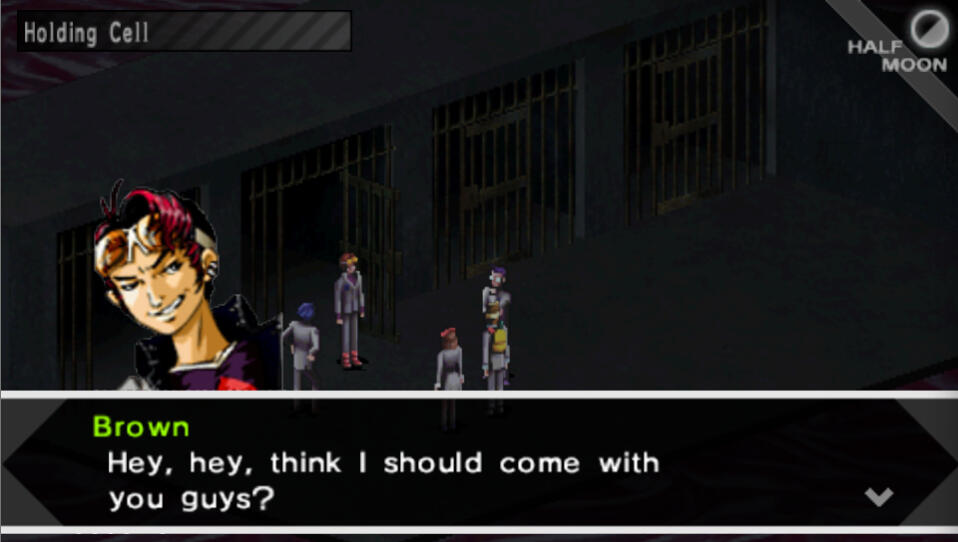 When you enter, there is a cutscene. Once in control, examine the key box in the upper corner to obtain Prison Key. Enter the door on the left. There is an Agastya Tree just across the hall if you would like to save your game. 1F is pretty simple so just follow the pathway until you reach the stairs, and head up to 2F. Follow the hall, taking a left at the first fork and a right at the second fork. There will be an Agastya Tree on your right if you'd like to stop and save, but otherwise, continue walking until you reach another set of stairs. head down the stairs to 1F and enter the room here around the corner. Watch a cutscene with Mark and Brown, and another automatic battle with some free exp.Brown/Hidehiko Recruitment: After the battle, Brown will ask to join you. Remember, if you allow him to join, you are locked in with him and cannot get any other party members after this. Make your choice, and continue.After the scene, make sure to select the optimal equipment for Mark, as well as Brown if you recruited him. Backtrack your way out of the Mikage Police Station and exit to the City Map.Next, we're heading to the Abandoned Factory.