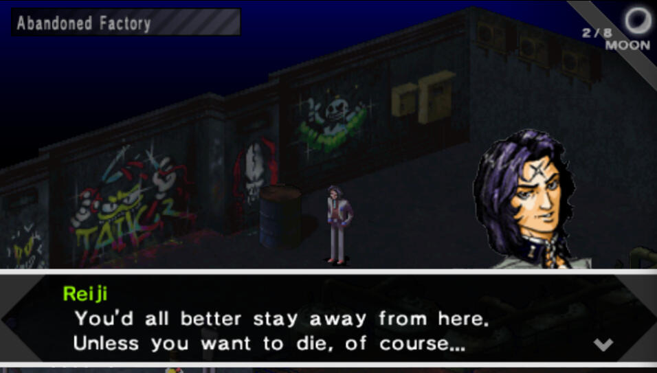 Once you're in control, speak to the girl here and then exit left after Maki. You'll notice that the hole in the wall is mysteriously gone. Enter the door to the school and head west to find the infirmary straight ahead at the end of the hall. After a quick scene, heal up and save your game.Next, head to 2F and find Class 2-5 right at the top of the stairs, and enter. The cutscene will explain a lot more of what's happening. Once you're in control, leave the classroom to see that the school map has now rearranged itself again. Head down the hall to the first room you see, it's a Velvet Room, and next to this room is the Infirmary. Two rooms north of the Infirmary is a General Store. This is a great place to grind and try to get spell cards if you like, but the Lilim enemies here cast Charm on your party and Mudo which makes you die in 2 turns, and it can get really frustrating.In this dungeon, there are doors that will teleport you to other places. You need to enter the correct doors in the right order to find the boss. If you turn to the right along the hallway next to the General Store, you'll find two of those doors. Enter either one.Now head north, you'll pass Class 2-1, and the hall turns east. Head east to those two doors on your left(east). Enter either one.Now, just northeast is a fork. Take the south path to find an Agastya Tree with a locked room beside it. Save your game, and head to the nearby hall that heads east right to a staircase, and take the stairs up to 2F.Now just head south west until you hit the big fork and take the west path, and follow it around north, west, and south again to reach a classroom and enter. Do NOT pass the first classroom door, or you will fall down to the next floor through a hole.Reiji Recruitment: If you did all the previous Reiji steps and you also did not invite any other members as your 5th person, Reiji will automatically join you after this cutscene.After the cutscene, you can open the left and right chest for a Metal Card and Turquoise. Do not open the middle chest, all it does is poison you. Exit the classroom through the top door in order to bypass the pitfall in the hallway. Head around the corner and enter one of the two doors to teleport to the next area.Now head west, and then as far south as the map will let you, then turn east until you hit a corner, head north and you should see stairs around the corner from the middle path. Head down to 1F.Right around the corner to the west is an Agastya Tree and a Velvet Room. When you are ready, head into the big room to the south for a boss fight.Boss: Tesso: This is just an endurance battle. Tesso has a gatling gun attack that deals high damage to a single target,
