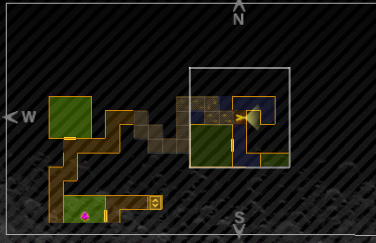 Once to the other side, you can also use the screenshot above to follow the path up to the northeast corner where you will find an Agastya Tree room. Go in and save again. From here, head west past the hall you just came from, and south to the dark room once again. Your path from the tile directly outside is: 1S, 1W, 2S, 1E, 1S, 3E.