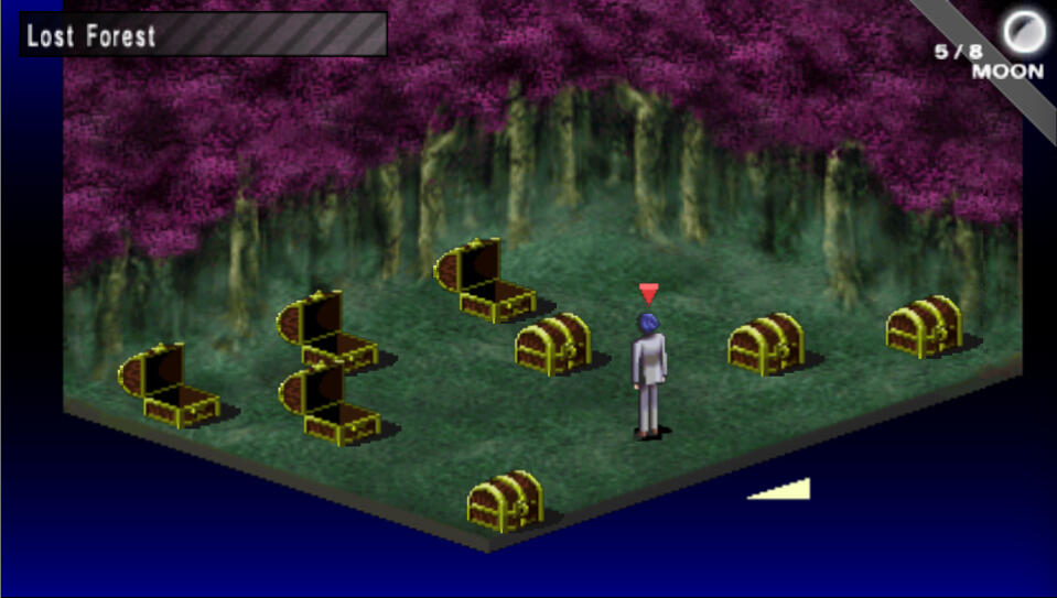 The first stop is one screen north, at Mana Castle. After the cutscene, head back to the Mikage Subway. You're making your way back through to that boss room, through to the other side, and back to the other entrance to make your way to the 1st Ward again.When you emerge, just head north one screen to find the Lost Forest. There is an Agastya Tree next to it, so you can save before entering. Enter the forest when you are ready.From the entrance, west is an Agastya Tree, south is a Fairy Spring, and east is where you need to go. So use those if you need to, but keep note that there are spinning tiles in this map that rotate you. As you head east from the entrance, take the second path that goes south. Follow this path up to the northeast corner, then keep following it south from that corner. Keep heading south past the square hallways until you see a long hallway going east and west. Follow it west and then south and enter the room to find 8 chests. Only open the 4 chests in the image below to obtain Gottabe Shoes, Fomor Lineage, Metal Card, and Moonstone.