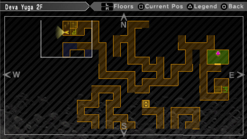 Straight ahead as you enter, there are a bunch of rooms that will help prepare you to go directly into another dungeon. The first room on the right is an Agastya Tree, behind it is a Velvet Room. On the left side of the hall is a Fairy Spring and a General Store. When you're ready, take the elevator to 2F.On 2F, head east, south, east, north, and south at the fork and keep heading south until you see a room to the west. Enter. Open the three chests to obtain Muscle Drink x4, Chewing Soul x2, Repulse Bell. Go ahead and retrace your steps back to the elevator and take it up to 3F now.On 3F , head south until you reach the fork. We are heading east here, but just FYI, if you were to go west and through the gate north, there is a hole that makes you fall down to 1F if you need to go back to save, heal, etc. Anyway, head east at the fork, through the open area, and take the first hallway that leads south. keep following this path until you see a staircase to the west and go down these stairs to 2F.On 2F, it's a pretty easy path so just follow it north and back south until you reach another staircase. Take them down to 1F.On 1F, head west and a bit south to find an Agastya Tree room. When you're ready, go ahead and go back east from the room and head north. When you hit the fork, head west and then north and try to work your way to the east side of the map to find another set of stairs. There is a screenshot below to help since this floor is a bit complex. Take the stairs up to 2F.